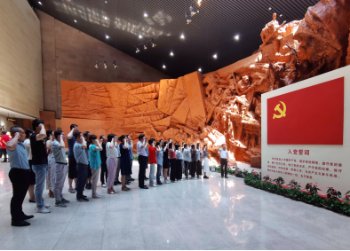 在渡江战役纪念馆一楼大厅,面对鲜红的党旗,全体党员同志高举右拳重温入党誓词,铿锵有力的宣誓声直击人心,表达了爱党爱国的坚定信念和矢志不渝的奋斗决心。在解说员的带领下,全体人员集体参观学习纪念馆六大展厅,追忆波澜壮阔的革命历程,缅怀革命先烈的丰功伟绩,感悟红色经典的时代内涵。