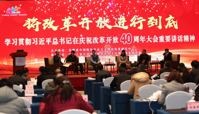 王先柱教授、陈东教授与来自安徽大学、安徽师范大学、阜阳师范学院、中共安徽省委党校等4位青年学者一起紧扣“习近平总书记在庆祝改革开放40周年大会重要讲话的金句”“创新是安徽最为宝贵、最具优势的‘遗传基因’”“改革开放40年宝贵经验首要是必须坚持党对一切工作的领导,不断加强和改善党的领导”等话题展开讨论,与来自全省各高校和社科研究机构的110多位青年专家交流分享了学习心得体会。