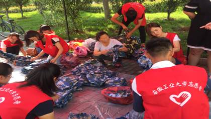 青年志愿者协会联系学校附近工地上的负责人,确定好回收来军训服装的去向,并召集相关人员向周围同学借一定量的学校发的军训包用以装回收来的军服,并对参与活动的人员进行部署,部门内部人员通过转发说说的方式为本次活动做宣传。