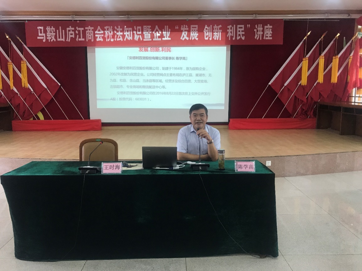 报告会由马鞍山长运集团董事长王时海主持,安徽安德利百货股份有限公司董事长陈学高主讲,陈董事长从企业的“发展、创新、利民”三个角度畅谈了自己的想法。陈董事长以创业者的身份,从“企业与政府关系”、“徽商的教训”解释企业如何在困境中发展,从 “企业经营模式”、“分权管理模式”、“突破瓶颈、颠覆格局”分析企业如何锐意创新,以企业“核心价值观”、“经营使命”解答企业如何为国家、员工、消费者做出贡献。陈董事长还特别以“鹰之重生”故事指出了企业如何走出困境。他强调,企业经营的本质就是经营人心,要善待员工、善待供应商和善待消费者。
