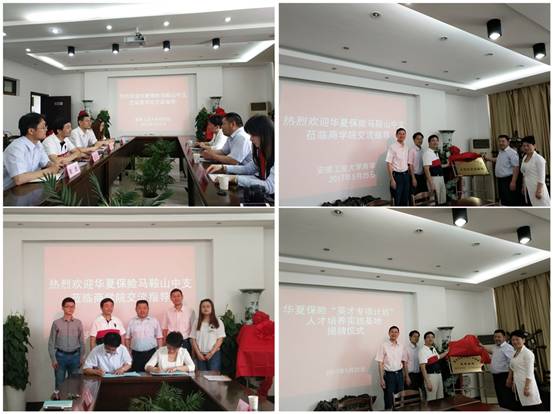 与华夏人寿保险股份有限公司马鞍山中心支公司在秀山校区汇文楼B304举行了校企合作签约揭牌仪式。华夏保险马鞍山中支公司总经理卓飞,销售部经理韩云,博彩