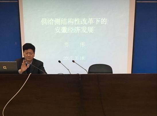 韦伟教授主要阐述了当前国际经济形势、供给侧结构改革、供给侧结构性改革下的安徽经济发展等三方面问题。他从政治等多个角度解读我国经济形势,在经济全球化的背景下,进一步阐述了供给侧结构性改革的必要性。并从工业、农业、制造业等多角度,深入细致地分析了供给侧改革下的安徽经济发展。韦教授严谨的思维,全面的解读,睿智的分析赢得了大家阵阵掌声。