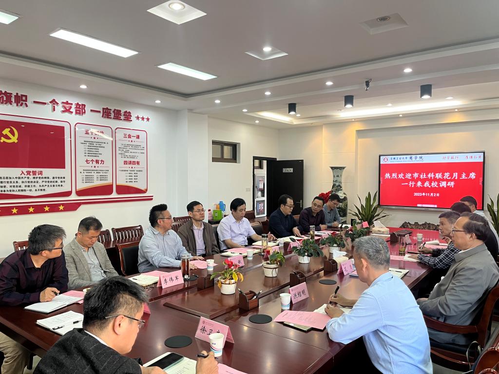 11月3日下午,市委宣传部副部长、市社科联主席花月,市社科联三级调研员张跃武,市经济学会会长洪绍明,市社科联办公室副主任王明银等一行来校调研智库建设工作。科研处、人力资源处、博彩