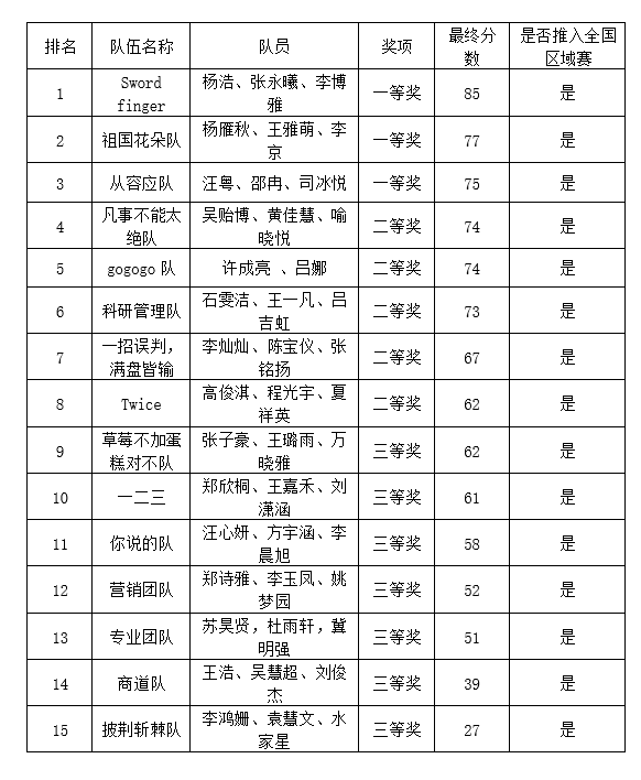 注:我校至多能推选十五支队伍参加全国区域赛,按照各队伍所获得的分数排序,拟推荐以上十五支队伍进入全国区域赛。公示自5月19日起,公示三个工作日,公示期间如有异议,请联系刘老师05552315486。汇文楼B117。