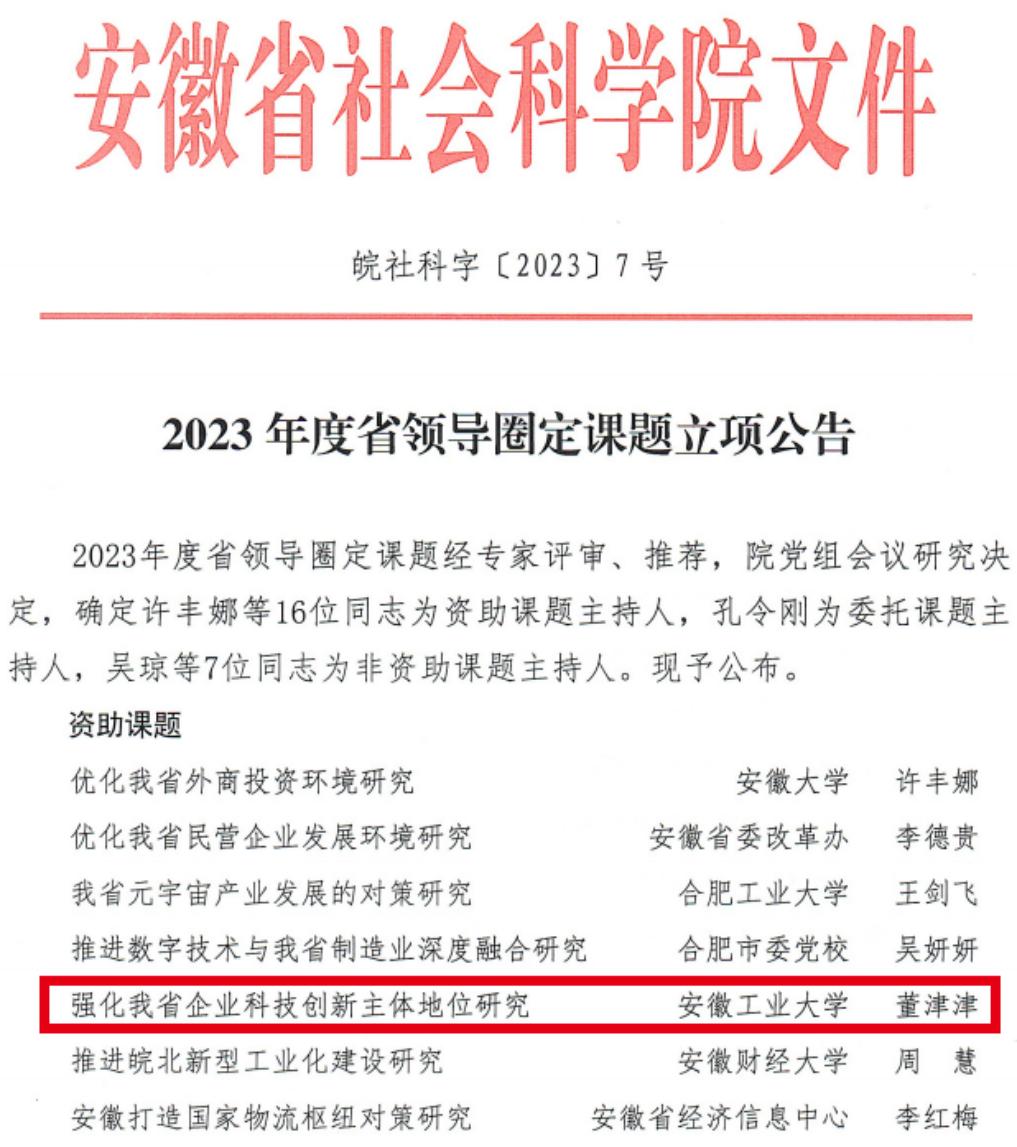 青年教师董津津博士申报的 “强化我省企业科技创新主体地位研究”招标项目获得立项资助。本年度共有16项省领导圈定课题获得资助,其中,高等院校获批7项,我校1项。