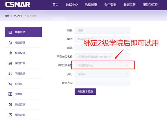 注册成功以后点击基本信息模块,绑定二级学院,即可使用。