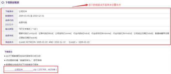 您将看到具体的条件设置信息,同时,下方显示查询数据的下载压缩包。点击压缩包名称,可直接下载数据到本机。注:下载数据仅保存48小时,您可以在博彩【下载记录】模块找到历史下载信息。
