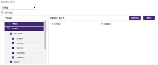 跨表查询提供了同一金融品种内大数据相关联指标的组合查询,操作方便快捷,用户可以灵活定义各种指标组合,定制所需的数据。目前包含股票模块。