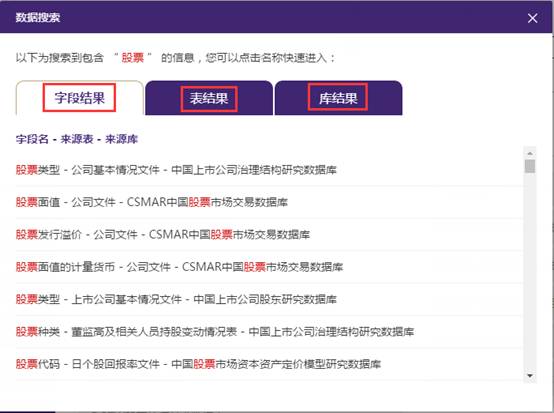 在字段搜索框中输入关键字,搜索框下显示包含关键字的十个相关字段、数据表、数据库信息,点击查找,将在数据库中将包含此关键字的字段/表/数据库结果查找出来。 比如输入“股票”,点击查找,在弹出来的对话框中显示搜索的结果。如图所示:
