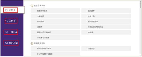登录成功后,进入网站博彩,博彩主要包括CSMAR最新滚动资讯、宣传活动、已购买、未购买、下载记录、我的方案、特色精选几个模块,其中: