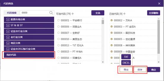 l 代码导出和保存:可以对已选代码区域的代码进行导出,导出格式有TXT和EXCEL两种,同时,还能将已选代码区域的代码保存,输入代码方案名称即可保存。在左侧【我的代码】模块进行查看历史保留的代码方案。注:【我的代码】只保存历史最新的10条记录。