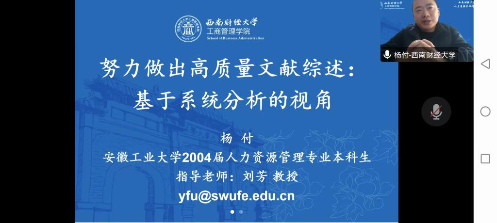 王兵副教授(会计学专业2001级校友),西南财经大学工商管理学院工商管理系主任杨付教授(人力资源管理专业2004级校友),贵州大学经济学院副院长、国家级人才朱满德教授(市场营销专业2001级校友),以及北京工商大学杨克智副教授(财务管理专业2002级校友)等七位校友,分别做了题为《Taking a Second Look at the Bait: Exploratory Innovation and Venture Capitalists’ Staged Investment》《地区赌博文化与企业盈余管理——基于组织内部非正式关系的视角》《自留地中硕果累,公共地上花满枝——浅谈科学研究和教书育人的双向融合》《发挥内部审计与监事会协同效应:审计总监兼任监事视角》《努力做出高质量文献综述:基于系统分析的视角》《学业学术的体会感悟》《内部审计在国有企业防风险促发展中的作用研究》等报告。