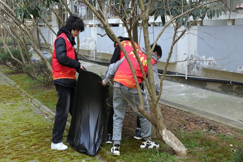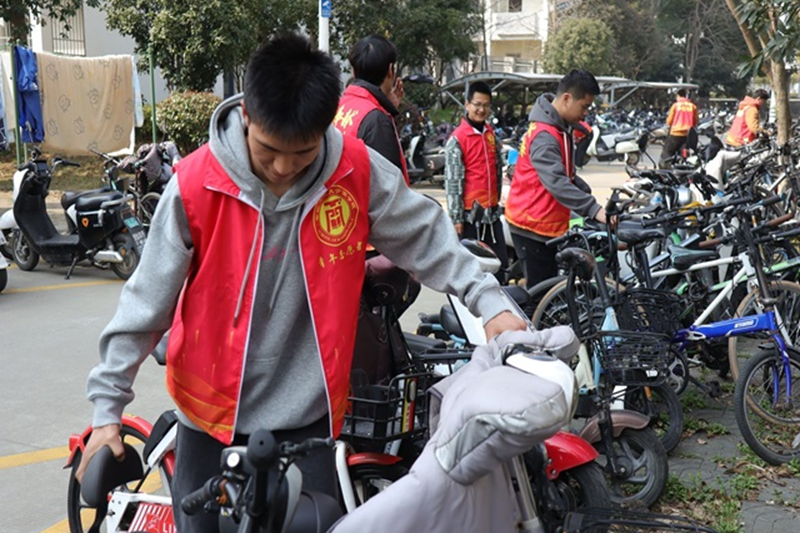 组织志愿者于秀山校区K栋宿舍楼及其周边开展志愿服务活动,美化宿舍环境,整理电瓶车摆放。