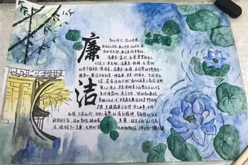 本次活动从线上征集以“廉洁文化”为主题的书法、手抄报、宣传海报等三种形式的作品。在征集的作品中,学生以笔墨传情,书写廉洁之道;用丰富的色彩和生动的画面,融入廉洁文化,让人耳目一新。博彩